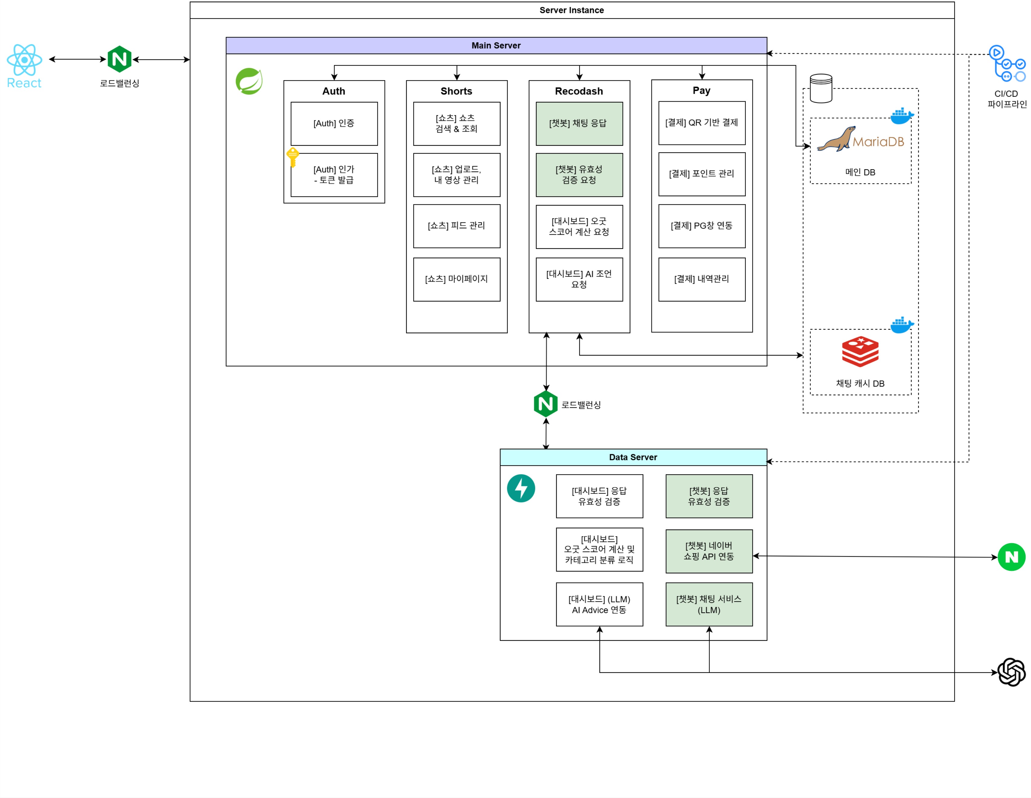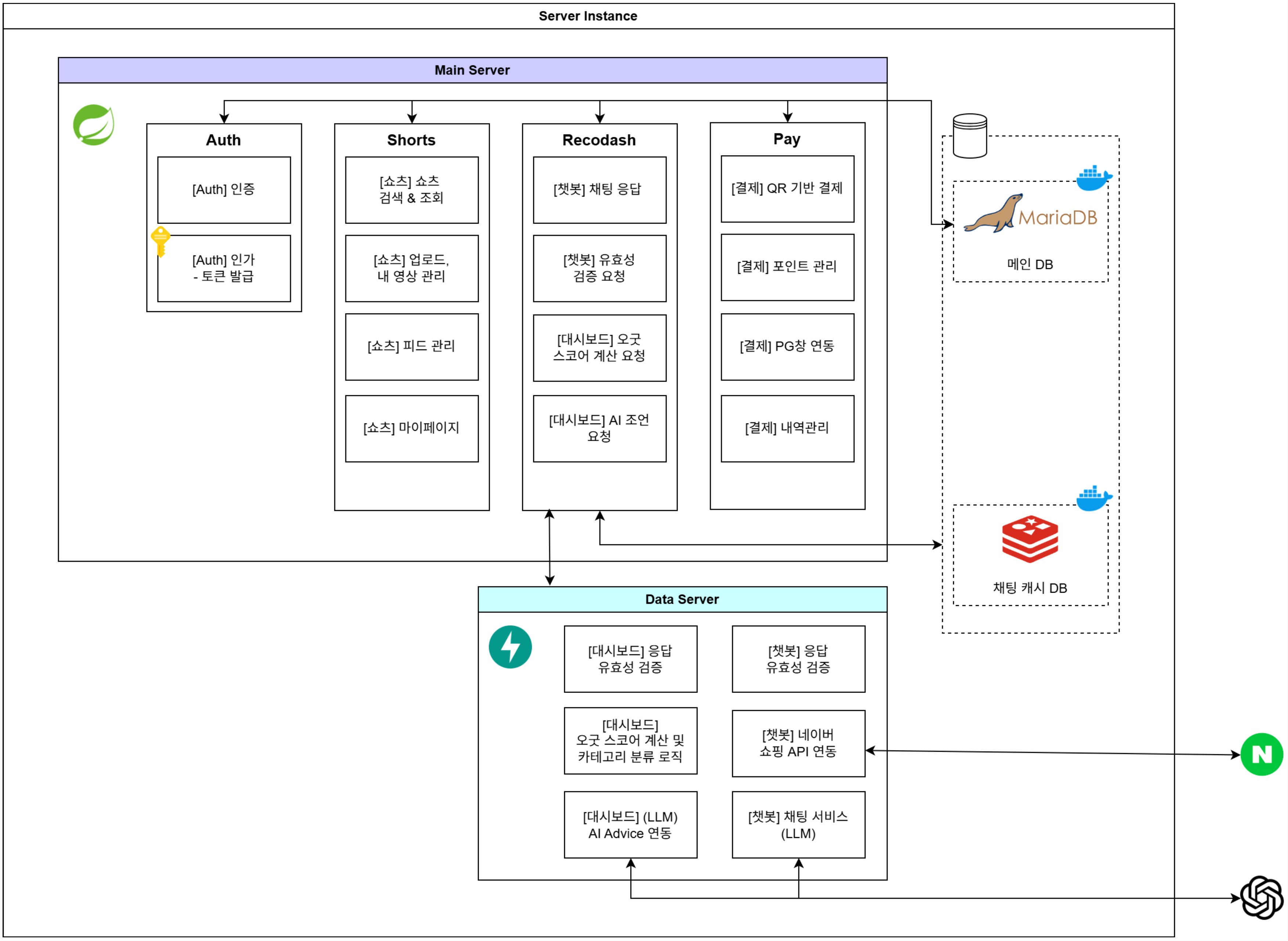 λ©μΈ λλ©μΈ (μ°λ¦¬ ν λ¨μμ΄κΈ°λ νλ€.)μΈ Shorts & Recodash (DATA) & Payλ‘ λλ μ ꡬμ±νμμΌλ©°, Data Serverμ κ²½μ° Recodash νλ§μ΄ μ¬μ©νκΈ°μ λ€μκ³Ό κ°μ΄ λΆλ¦¬ν΄μ ꡬμ±νμλ€.