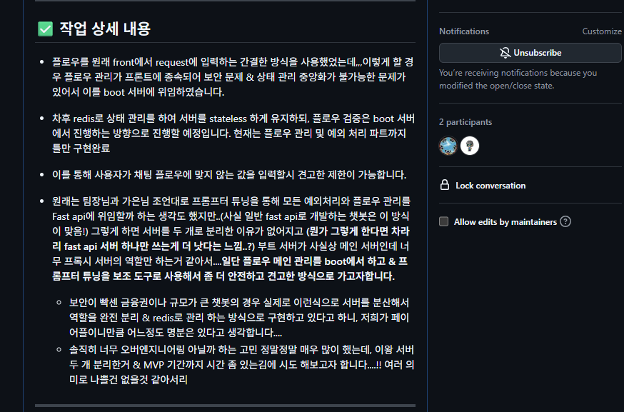 fast api ํ๋๋ก๋ง ์งํํ๋ค๋ฉด ํ๋กฌํํฐ ์์ง๋์ด๋ง์ผ๋ก ๋๋ถ๋ถ์ ๋ฌธ์ ๋ฅผ ํด๊ฒฐํ๊ฒ ์ง๋ง, boot์๋ฒ๋ฅผ ๋ฉ์ธ์ผ๋ก ๋๊ณ ์ ํ๋ค๋ฉด ์ด๋ ๊ฒ ๋ฉ์ธ ์๋ฒ์์ ํ๋ก์ฐ ๊ด๋ฆฌ๋ฅผ ์ฑ ์์ง๊ฒ ํ๊ณ , redis๋ฅผ ์ด์ฉํด์ ์๋ฒ ์ํ๋ฅผ statelessํ๊ฒ ์ ์งํ๋๊ฒ ํฅํ ํ์ฅ์ฑ์ ๊ต์ฅํ ์ ๋ฆฌํ ๊ฒ์ด๋ผ๊ณ ์๊ฐํ๋ค.