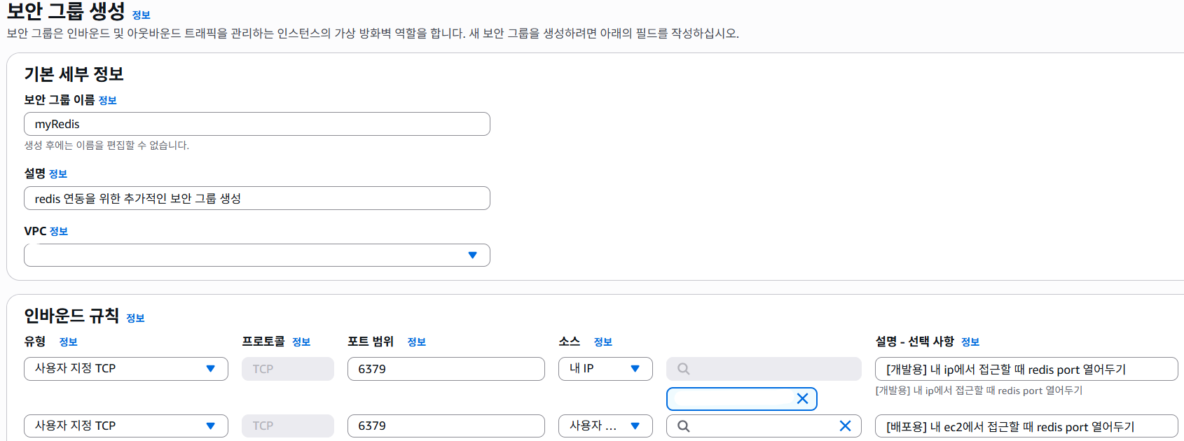 redis (elasticache)์์ ec2์ ์ ๊ทผํ ์ ์์ด์ผ ํ๋ฏ๋ก, ๋ค์๊ณผ ๊ฐ์ด ์ธ๋ฐ์ด๋ ๊ท์น์ ์๋ก ์ถ๊ฐํ๋ค.