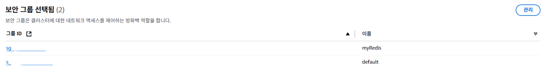 ์ด์ ์ฌ์ฉํ ๋ณด์ ์ธ๋ฐ์ด๋ ๊ท์น๊น์ง ํ๋ ๋ง๋ค์์ผ๋ elasticache๋ฅผ ์์ฑํด๋ณด์.